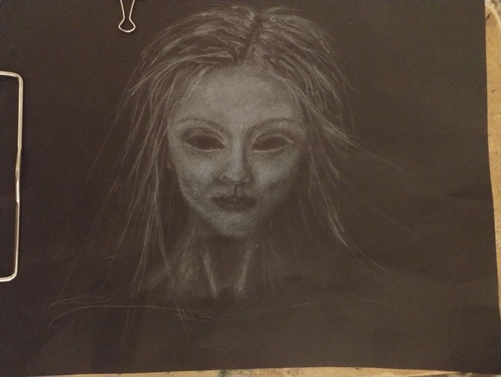 Today I added more highlights, extended lines for the hair, and started working around the eyes. I also started working with the neckline.
