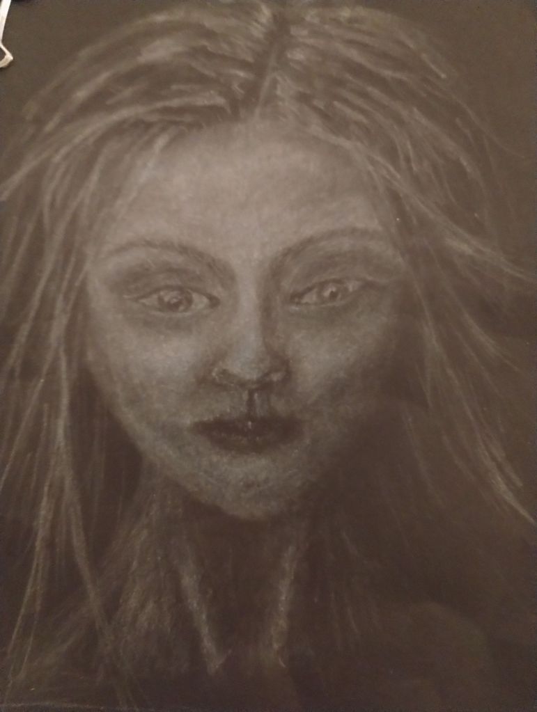 The eyes are still not balanced but I’m leaving them, to work on other parts of the picture. I’ll fix them before I put on the lashes and fine details at the end. If I do any of that now, it would smudge. I need to also continue to build the highlights around the eyes to create definition. My proportions are slightly off with the face and the lips need defined too.