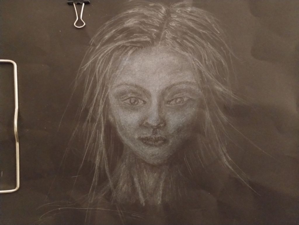 Today I added more around the eyes and lips. I don’t like everything quite yet. I continued to work on the left jawline and the neck. Tomorrow I’ll work on the neck and shoulders and try to figure out what the background will be.