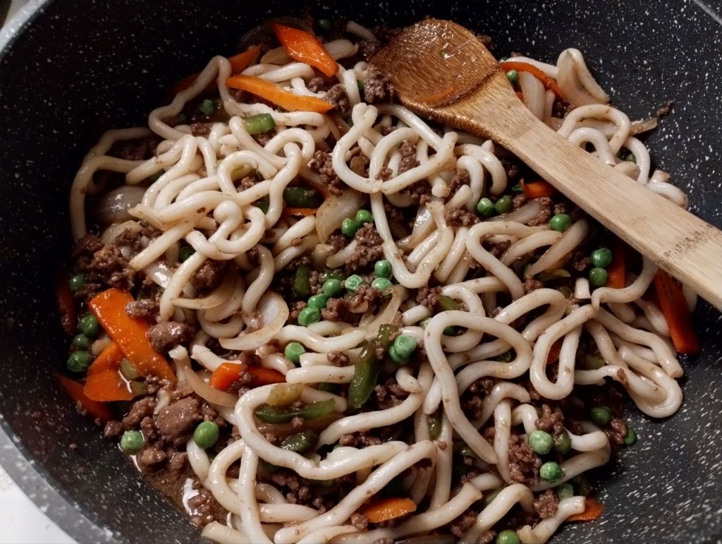 Saute veggies and ground beef together with soy sauce, garlic powder, agave (honey, fruit juice concentrate, sugar, or no calorie sweetener), ground pepper, and a few drops of sesame oil. After the beef is cooked add the noodles. Stir, serve, eat.