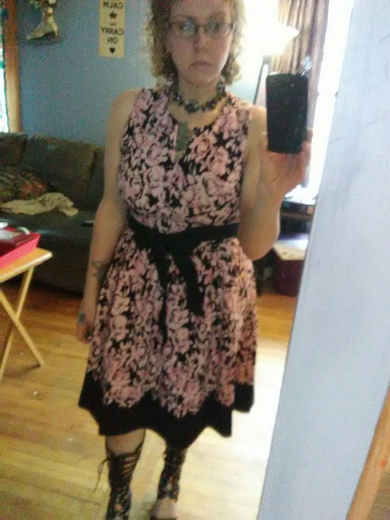 This outfit’s ancient! Both dress and boots made it through my second try at college. I was saving them for graduation but never expected to fit either again. There were many physical setbacks along the way. The largest were losing 100+ pounds and retraining a formerly broken ankle to wear heels.